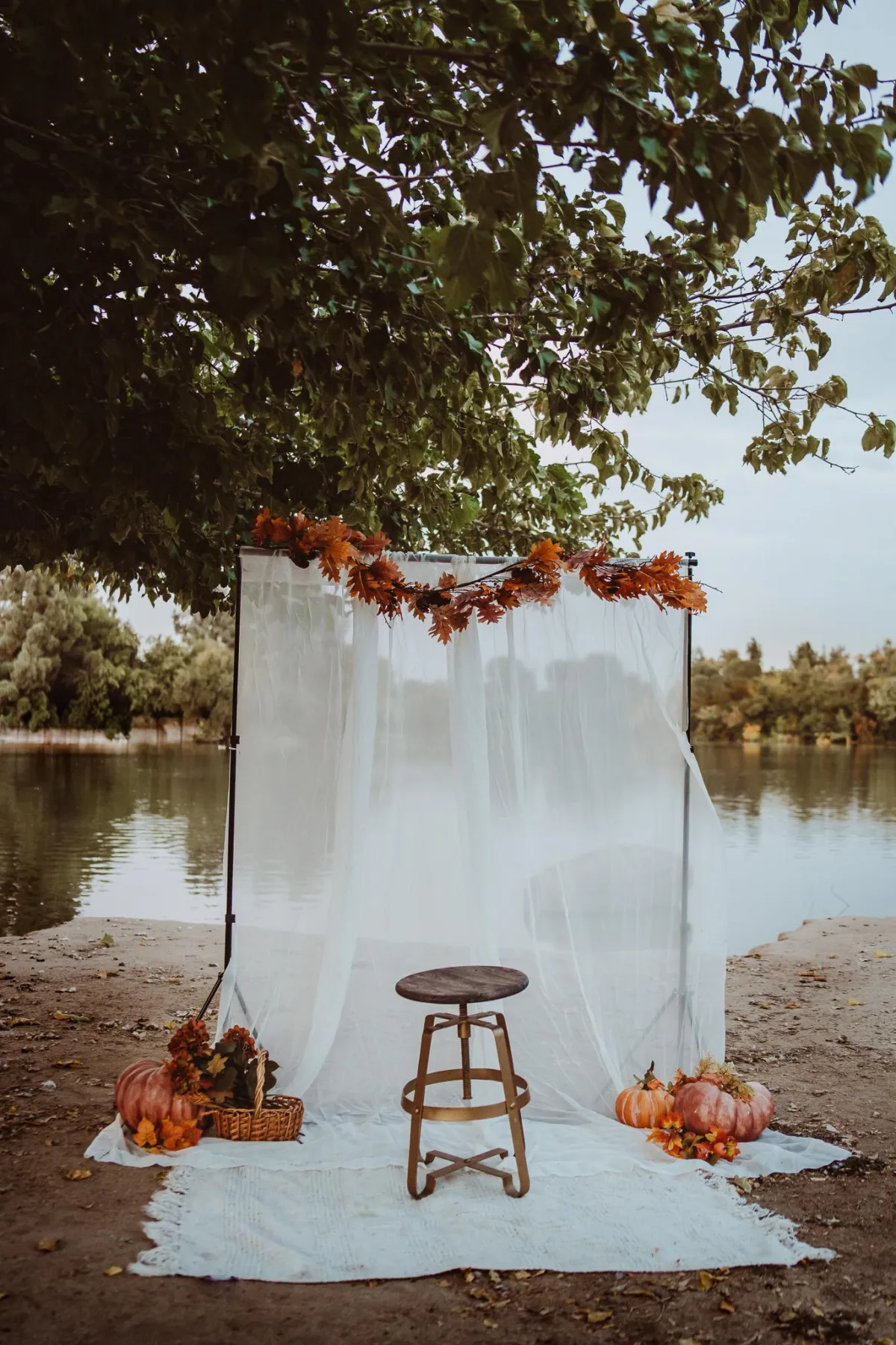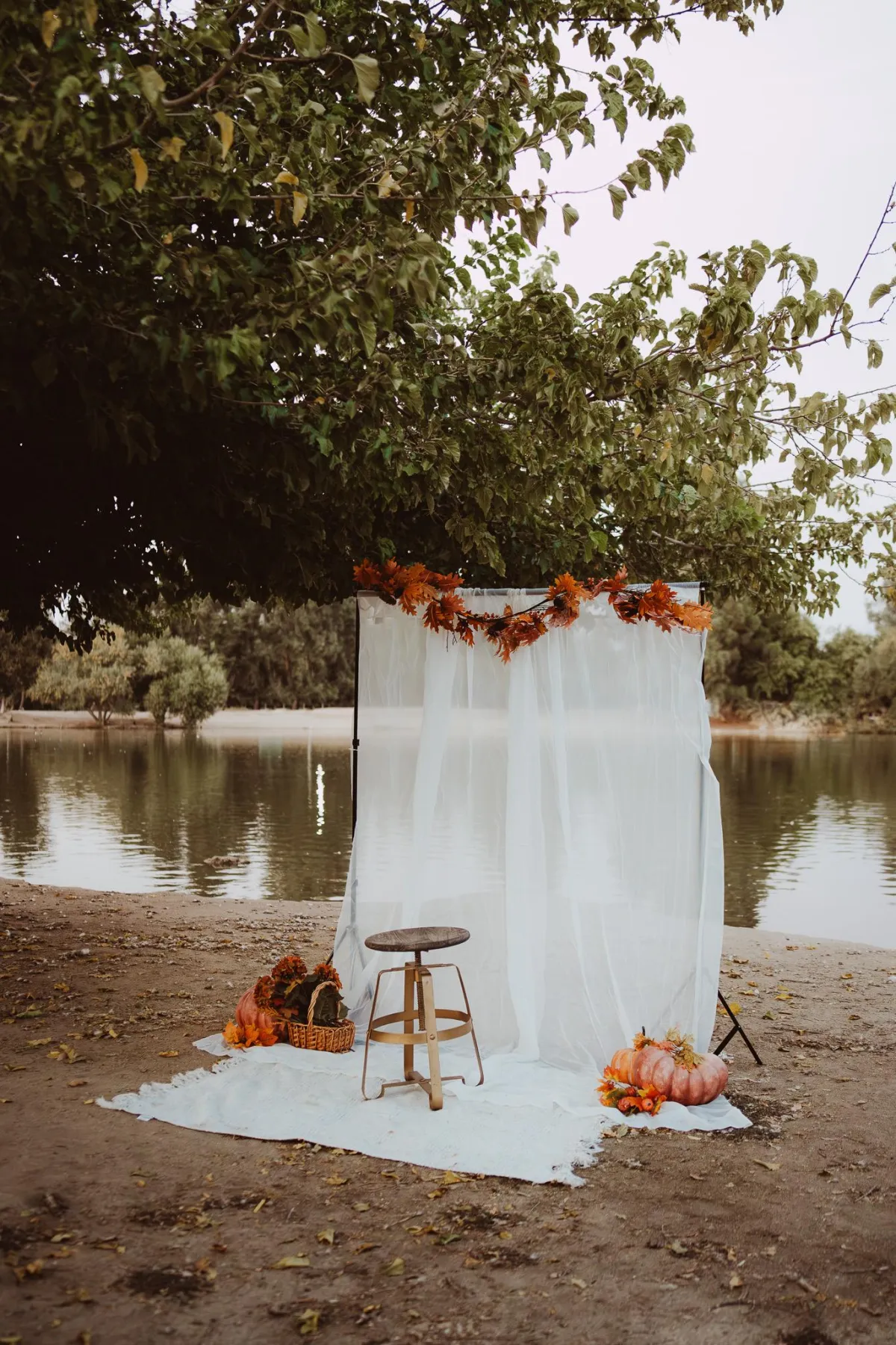 Location: Fresno Woodward park — lakeside with fall leaves & a styled autumn setup